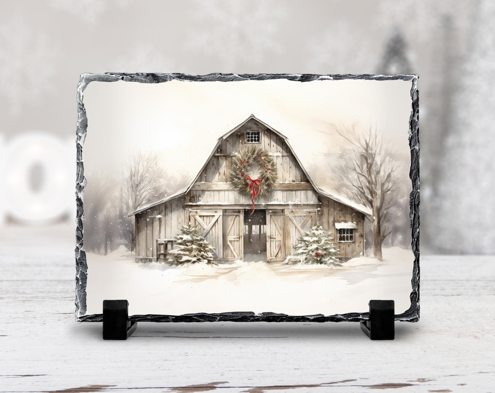 Rustic Christmas Slate Plaque with Barn Scene Wreath Snow Perfect Holiday Decor Gift