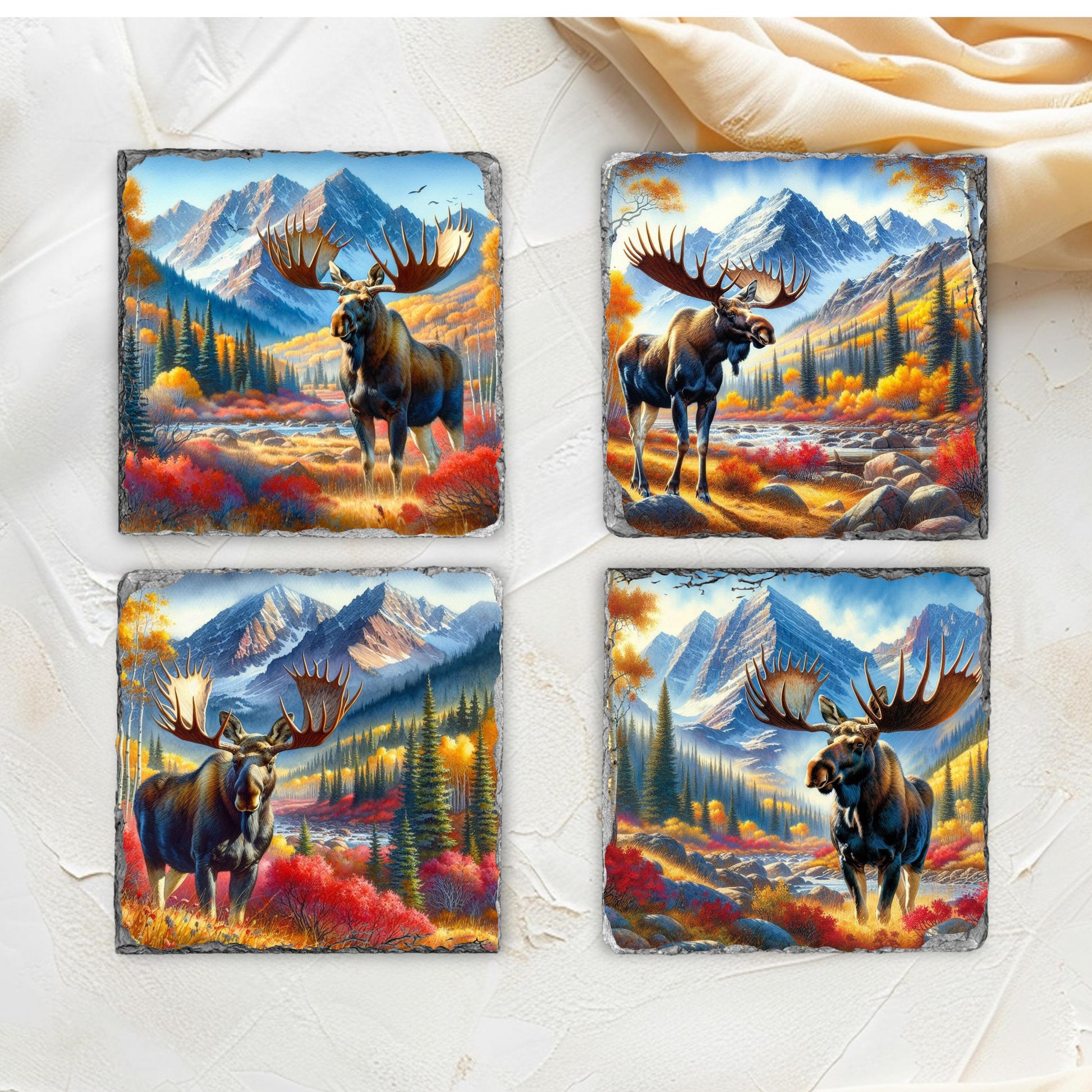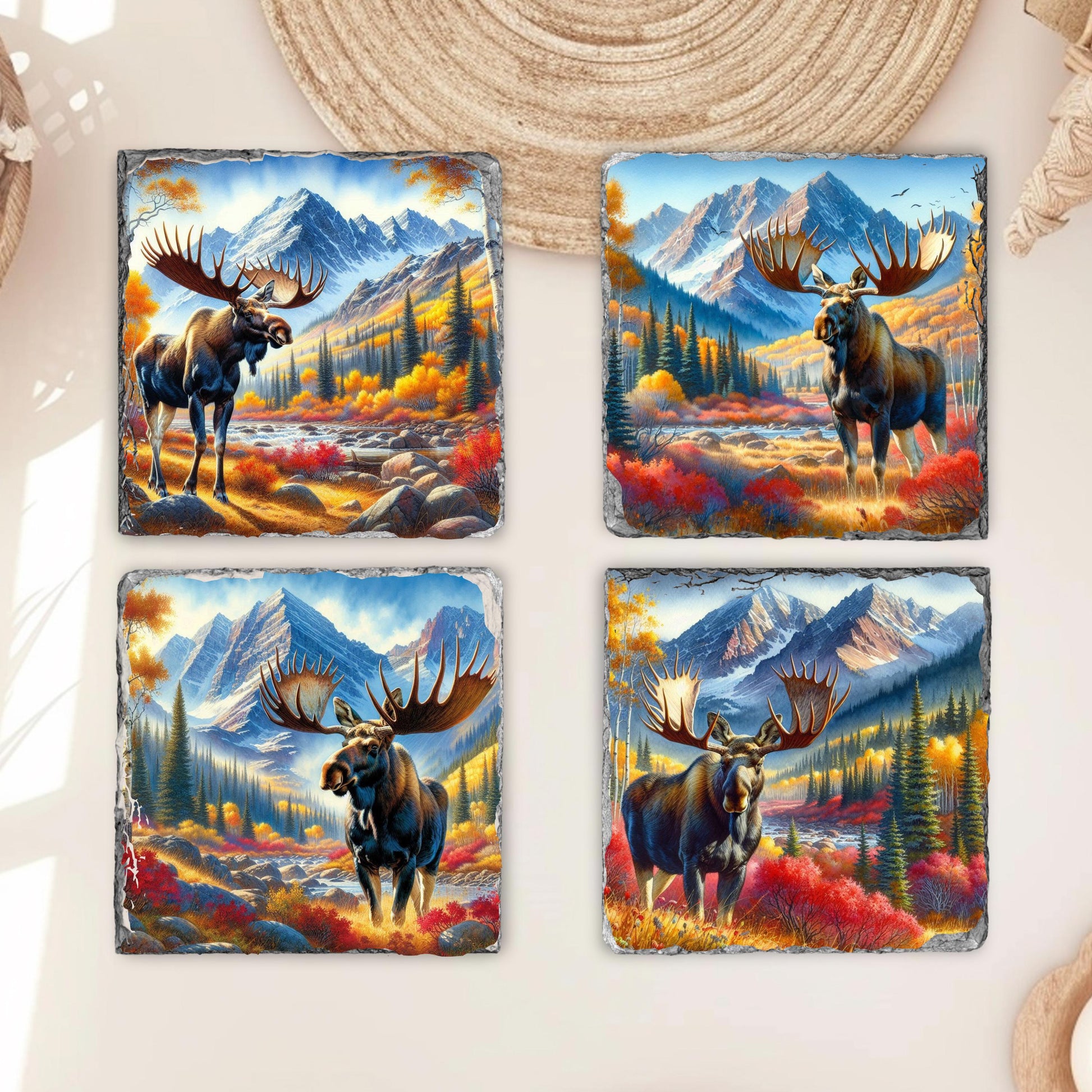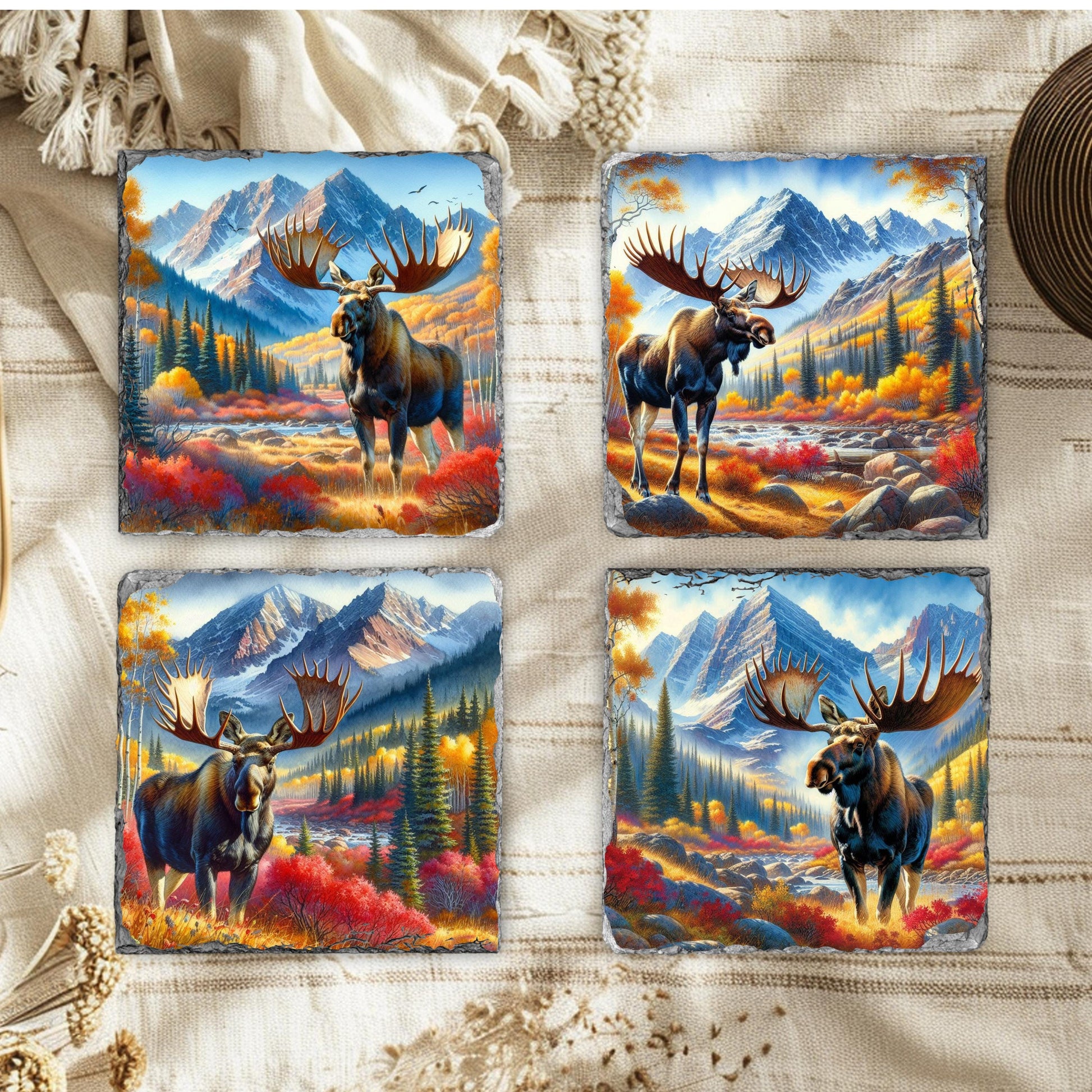 Bring a touch of wilderness and rustic charm to your home with this handcrafted slate coaster set. Each coaster measures 3.5x3.5 inches and features a stunning sublimation print of a majestic moose standing in a vibrant fall mountain valley. The images are vividly detailed, capturing the beauty of autumn with warm tones and natural scenery, making these coasters both functional and decorative.