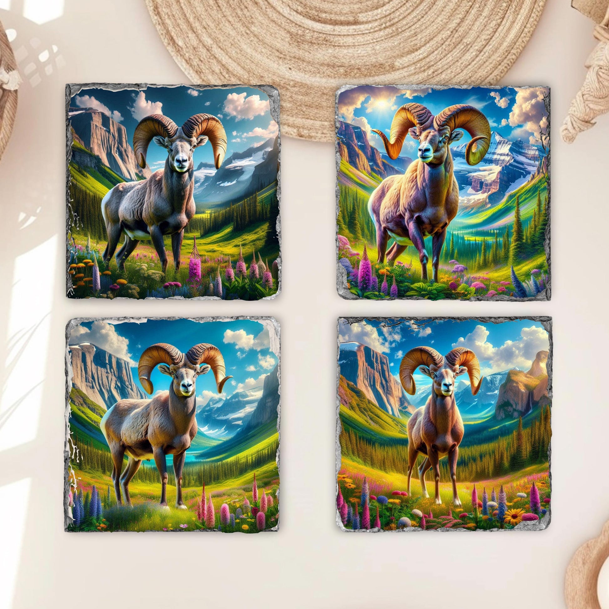 Slate Coaster Set Featuring Big Horn Sheep Mountain Valley and Wildflowers with Black Rack - Ideal Nature Gift