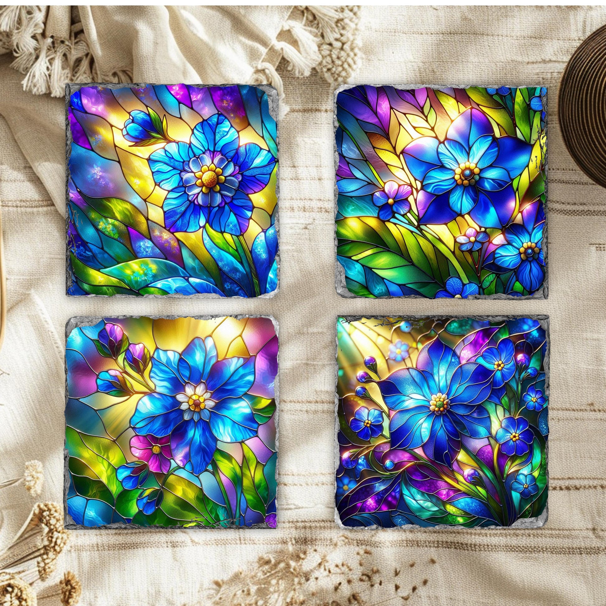 Enhance your home decor with this handcrafted slate coaster set, featuring a charming faux stained glass design of Alaska's state flower, the Forget Me Not. Each coaster measures approximately 3.5 x 3.5 inches and showcases four unique floral images that celebrate vibrant artistry and the beauty of nature. The naturally fractured edges of the slate add a rustic charm, making these coasters not only practical but also a striking decorative accent.