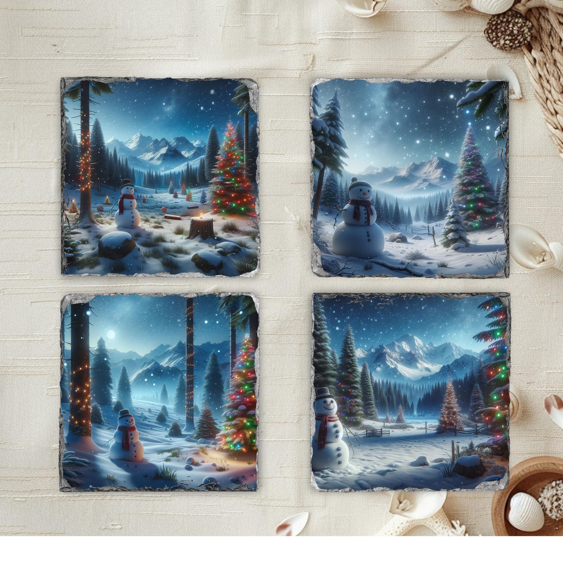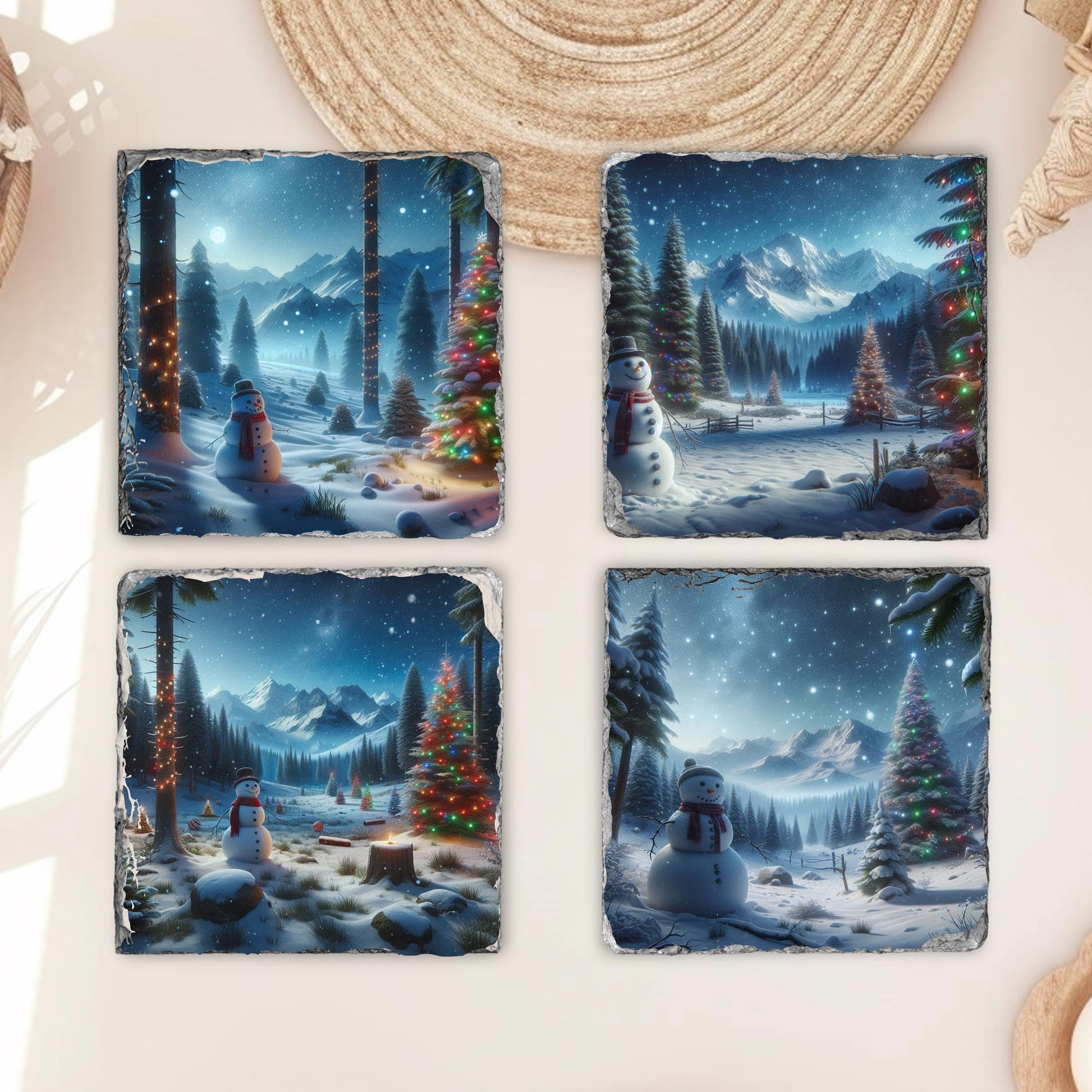 Embrace the warmth and joy of winter with our handcrafted slate coaster set, featuring four delightful sublimation-printed images of a cheerful snowman amidst a stunning winter mountain scene adorned with twinkling Christmas lights around pine trees. Each coaster measures approximately 3.5 x 3.5 inches and showcases unique fractured edges, giving them a natural and rustic charm that enhances your holiday decor or winter gatherings.
