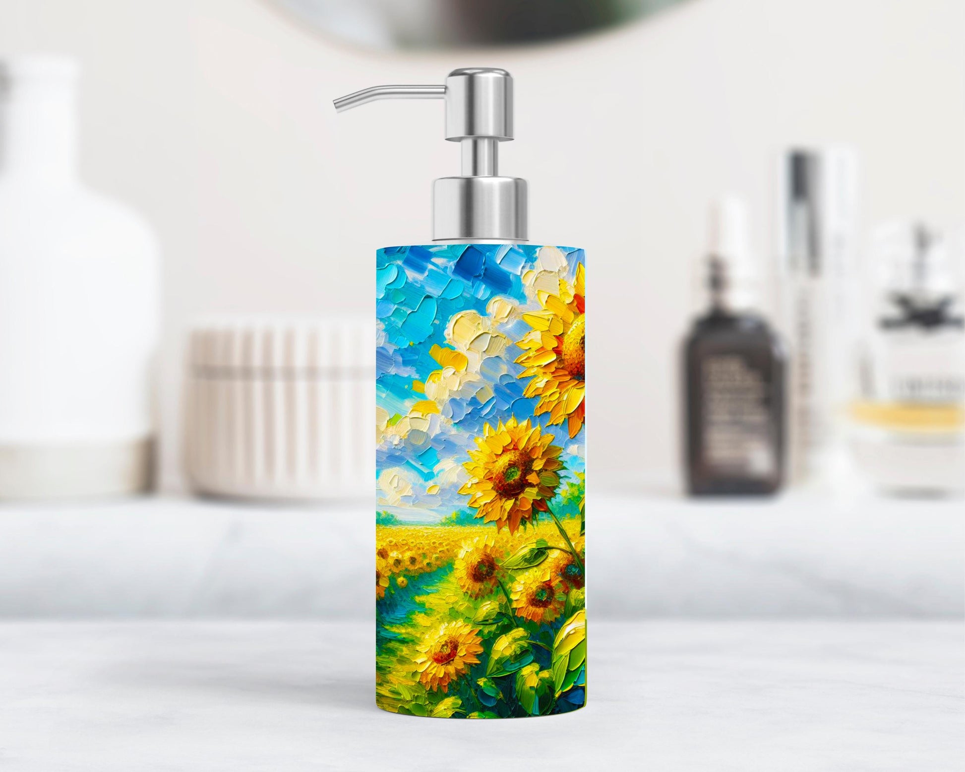 Add a touch of warmth and charm to your home with this delightful 18oz Sunflower Lotion Dispenser. Made from durable stainless steel, this soap and lotion pump features a whimsical sunflower meadow design that enhances both kitchen and bathroom decor. With a generous 18oz capacity, it provides ample soap or lotion for daily use or special occasions.