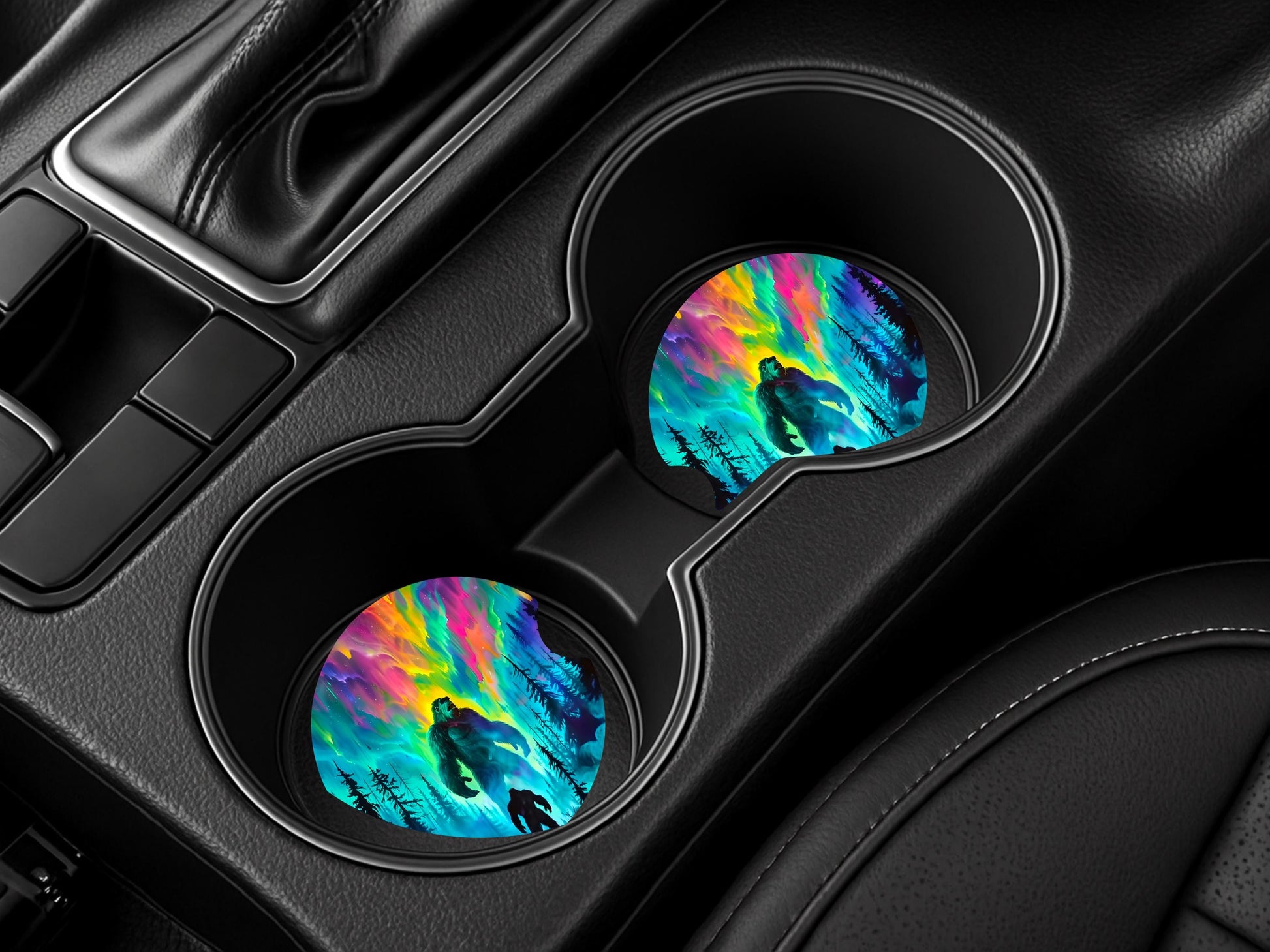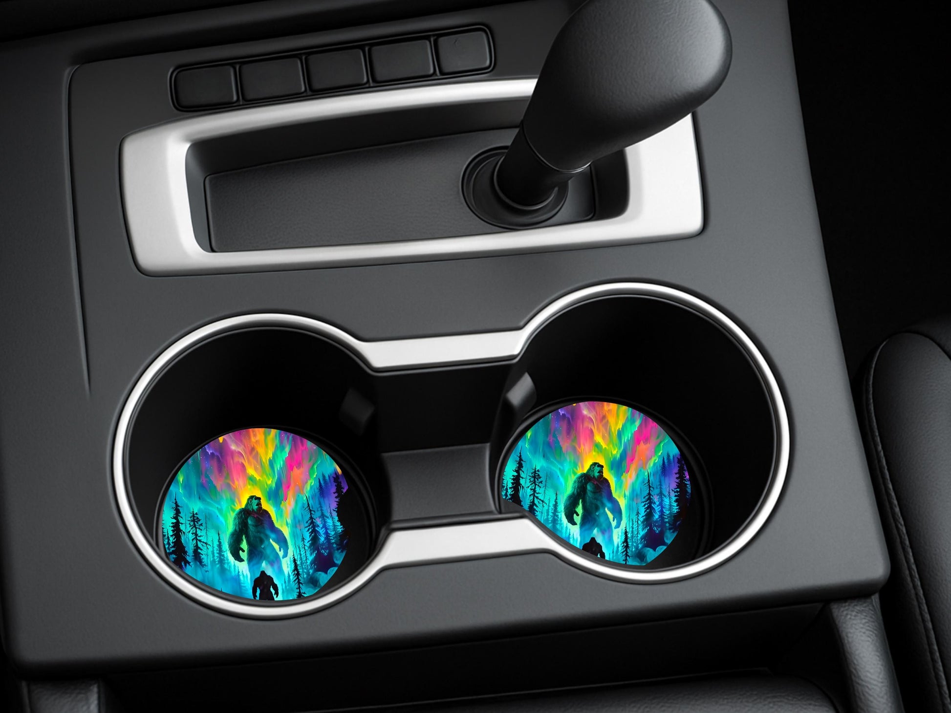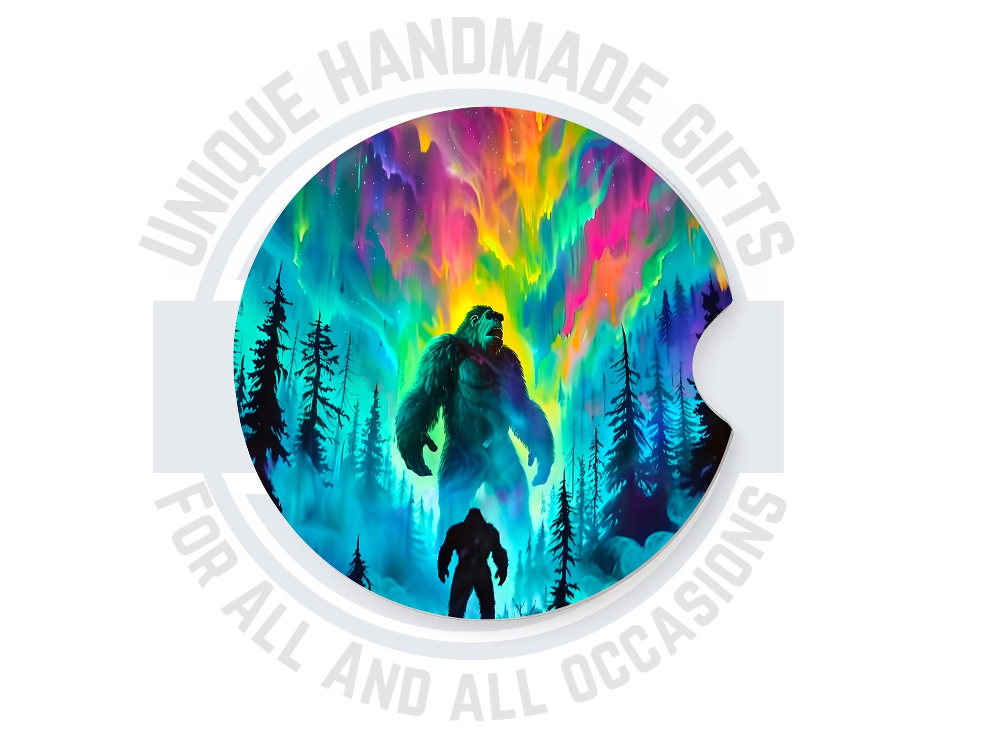 Add a touch of mystique to your car with our Ceramic Car Coaster, featuring a stunning northern lights forest scene with a playful Bigfoot peeking through the trees. Available as a single coaster or set of two, these coasters will keep your cup holders looking stylish while protecting them from drips and spills. Handcrafted with care, these coasters make a unique gift for any nature lover or cryptid enthusiast. Order yours today and bring a touch of magic to your daily drive!