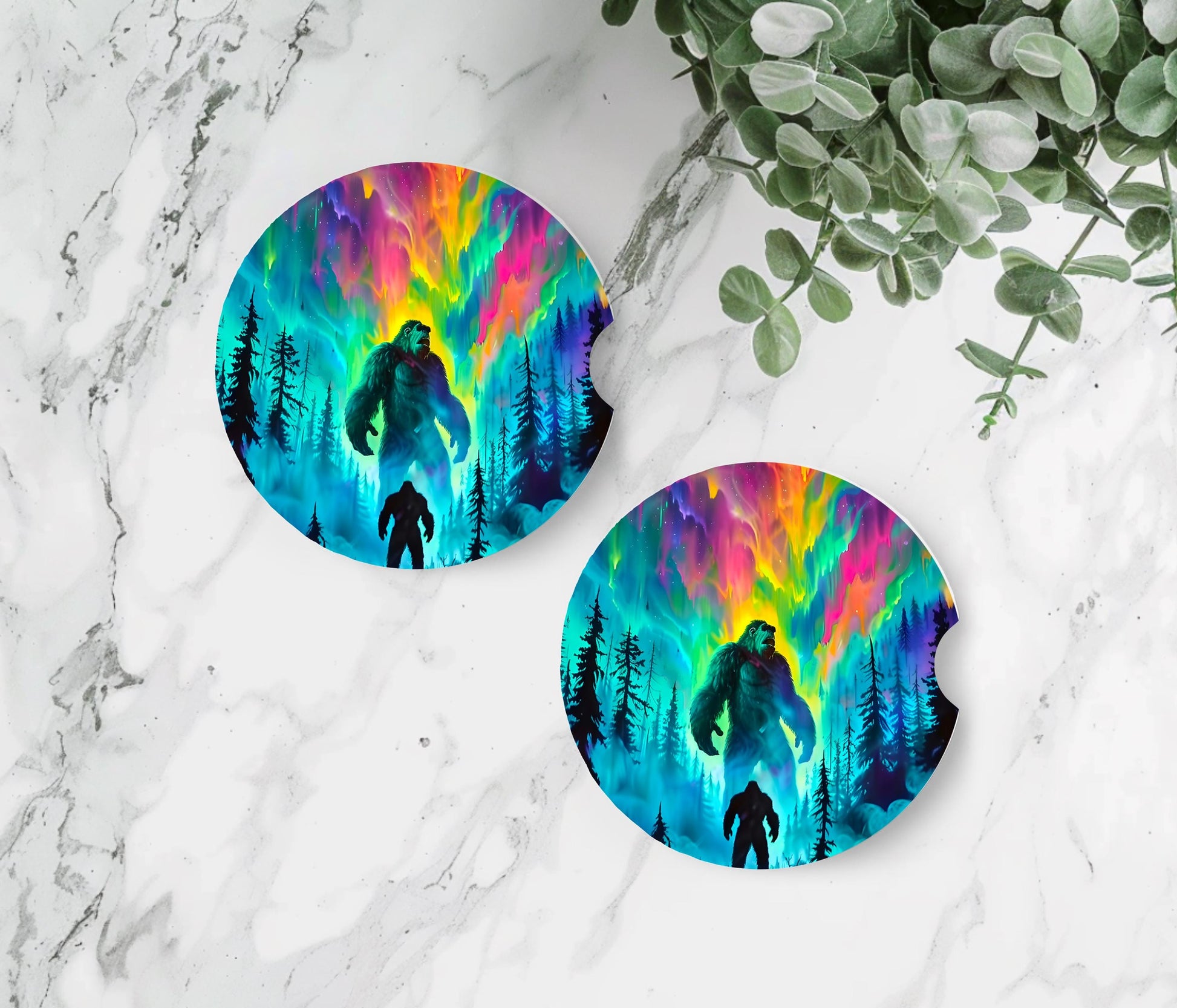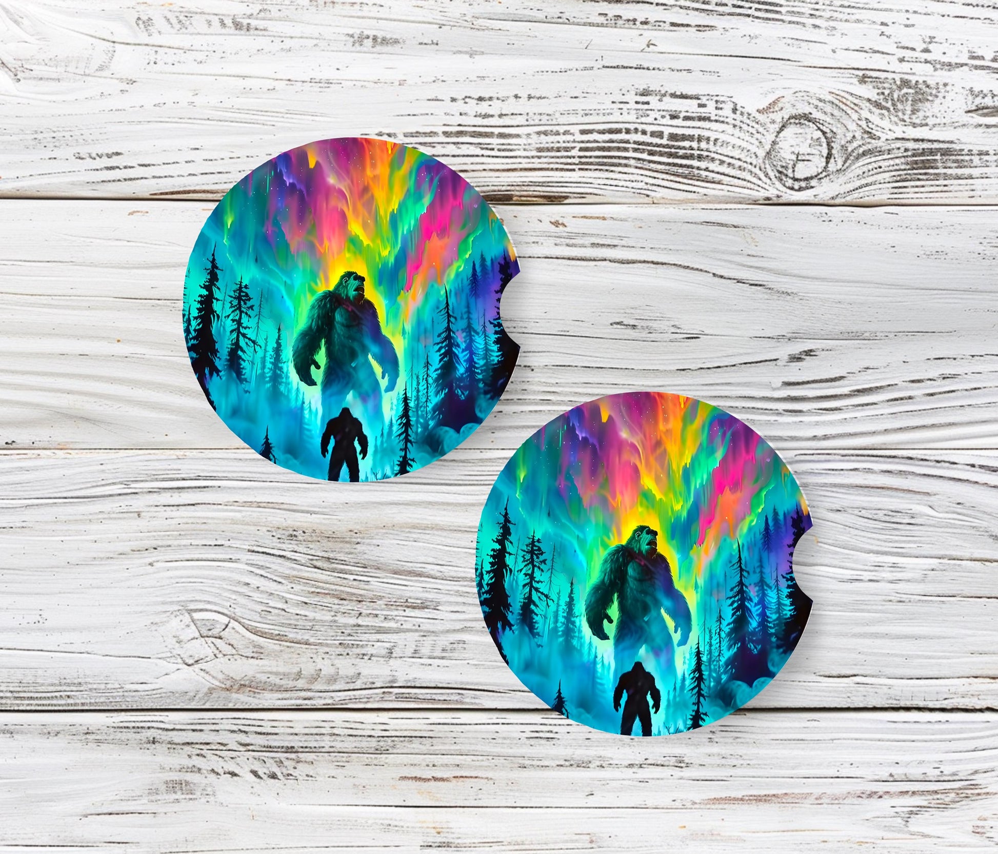 Unique Ceramic Car Coaster, Set of Two, Northern Lights Design, Bigfoot Gift Idea
