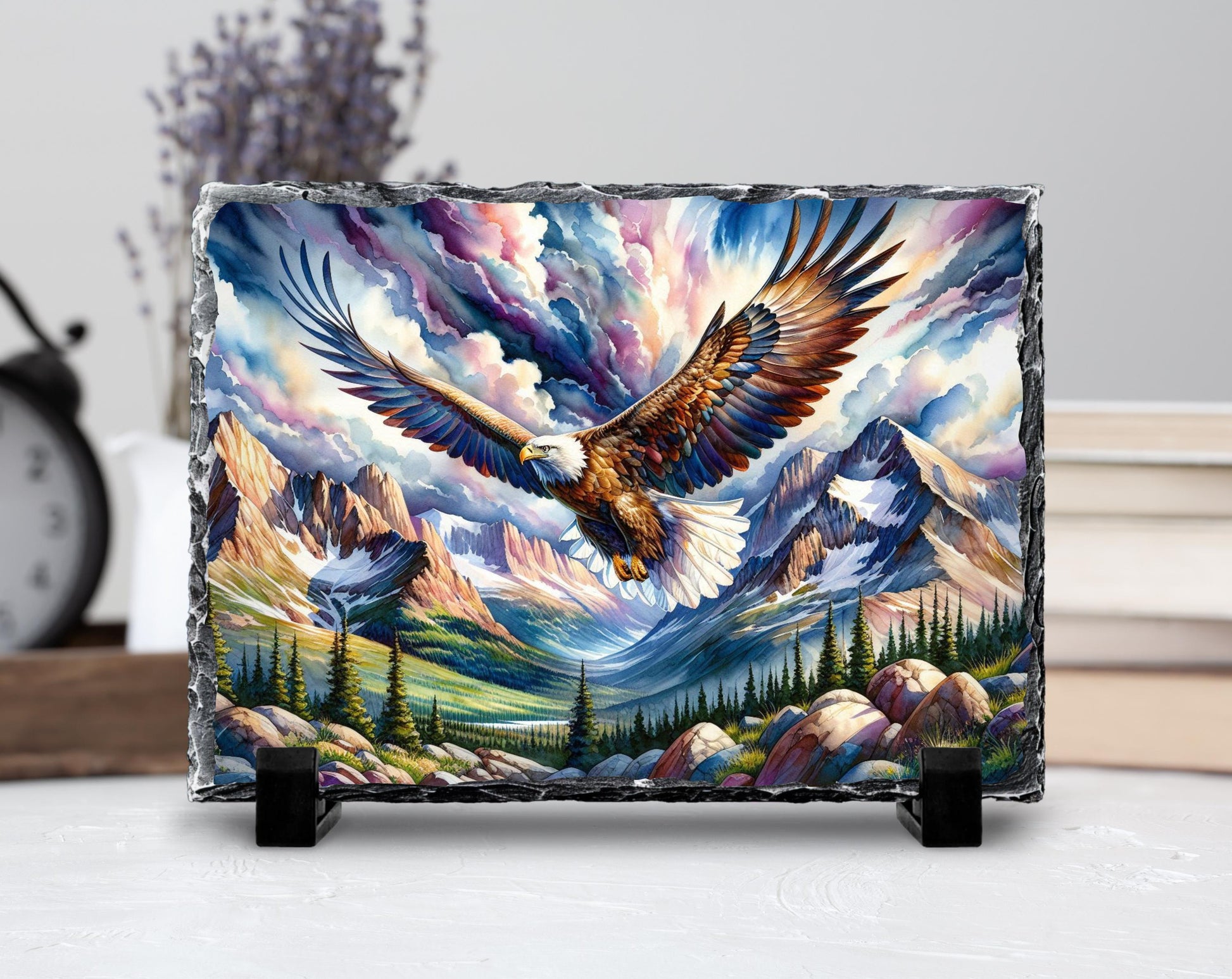 Embrace the spirit of freedom and the beauty of the wilderness with this handcrafted slate plaque, showcasing a stunning watercolor depiction of an eagle soaring gracefully over a majestic mountain valley. This artwork captures the essence of strength and serenity, making it an ideal addition to cabins, lodges, or any space that celebrates the great outdoors.