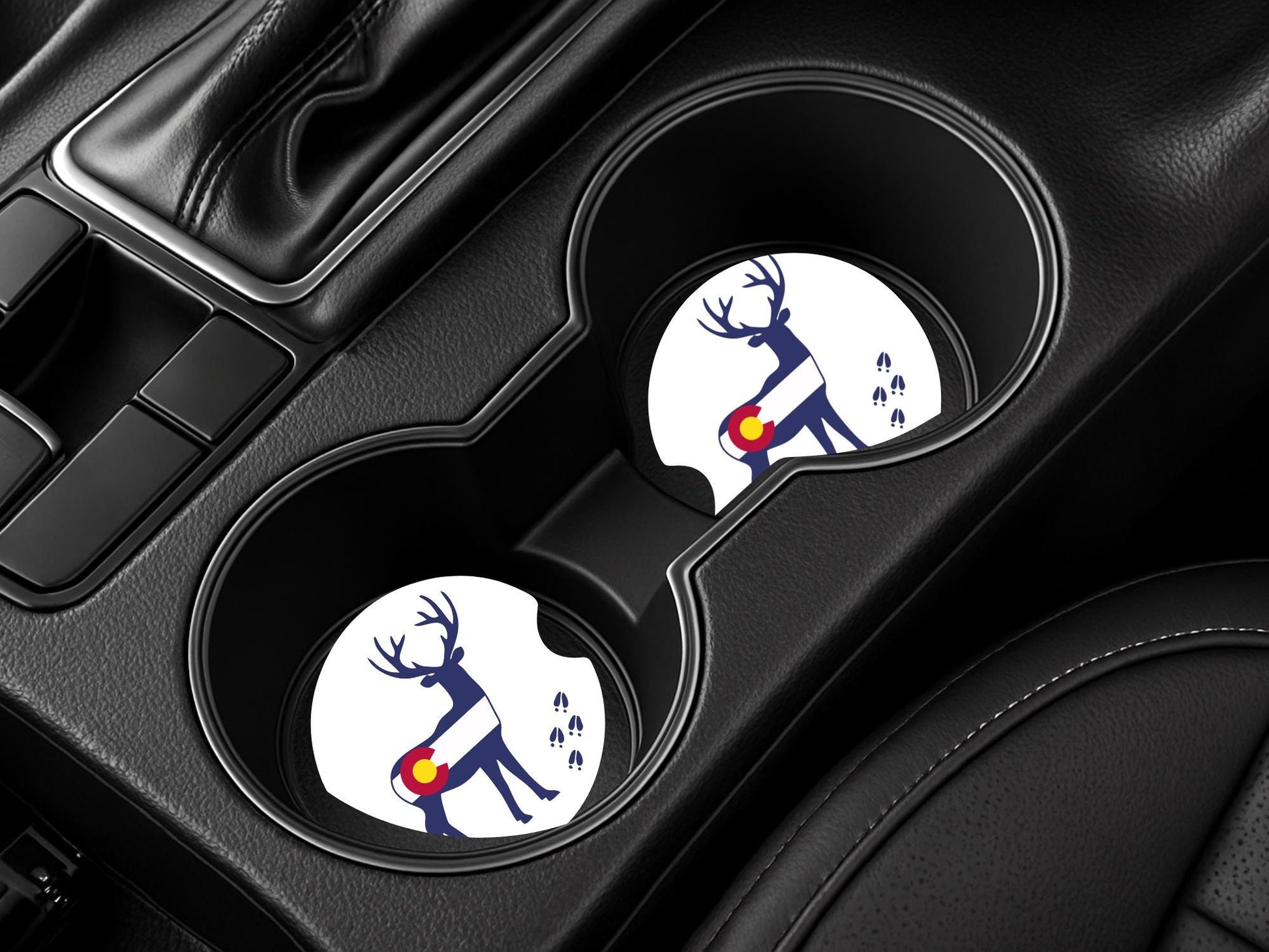 Elevate your car's style with these unique Sandstone Car Coasters! This set of 2 coasters showcases the Colorado Logo adorned with detailed deer and deer prints. Perfect for adding a touch of nature-inspired charm to your vehicle. Handcrafted with care, these coasters make a great gift for any nature lover. Opt for a single coaster or grab a set of 2 to complete your car's look. Drive in style with these charming accessories!