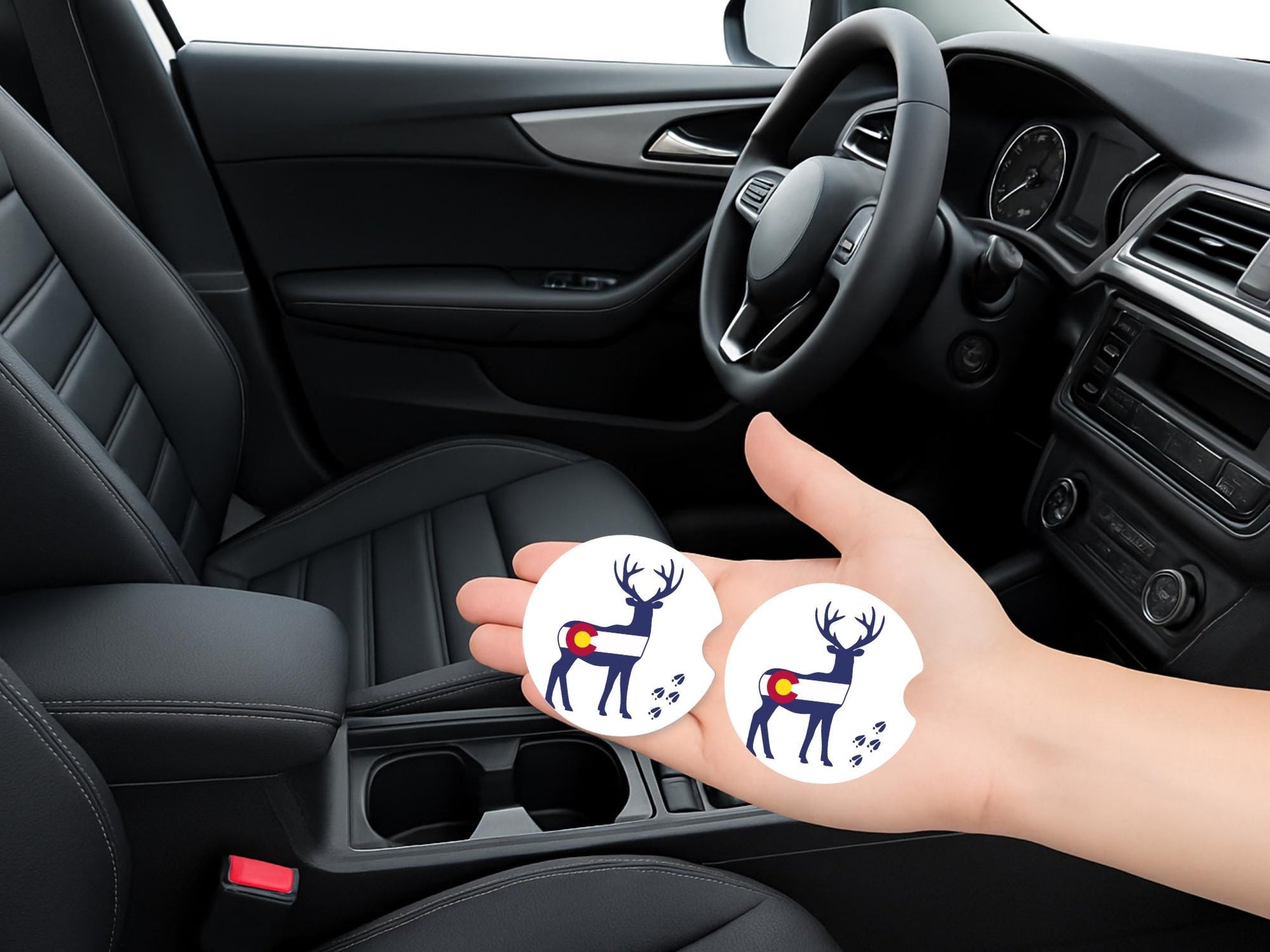Whimsical Deer Print Car Coasters - Set of 2, Colorado Logo, Sandstone Coasters