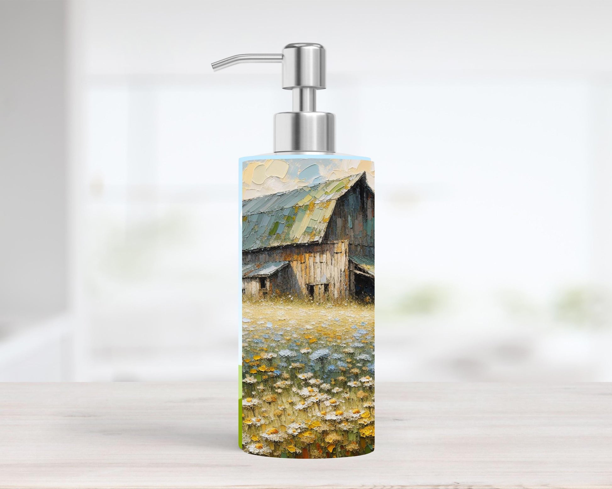 Bring the warmth of the countryside into your home with this charming 18oz stainless steel barrel soap and lotion dispenser. Adorned with a lovely watercolor illustration of a yellow and white wildflower meadow, complemented by a rustic old barn in the background, this piece seamlessly combines functionality with farmhouse-inspired artistry. Ideal for kitchen sinks, bathrooms, or laundry rooms, this versatile dispenser is suitable for liquid soap, hand sanitizer, or lotion.